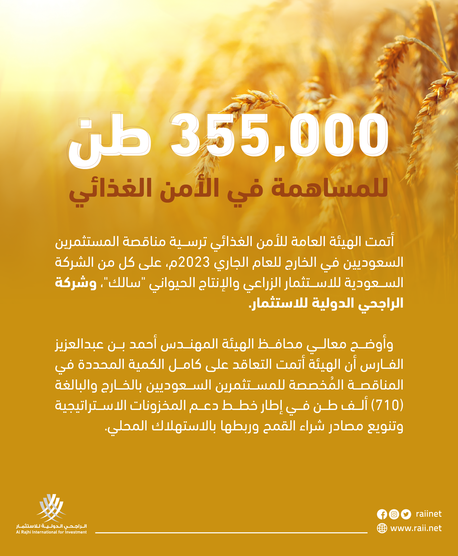 وأوضح معالي محافظ الهيئة المهندس أحمد بن عبدالعزيز الفارس أن الهيئة أتمت التعاقد على كامل الكمية المحددة في المناقصة المُخصصة للمستثمرين السعوديين بالخارج والبالغة (710) ألف طن في إطار خطط دعم المخزونات الاستراتيجية وتنويع مصادر شراء القمح وربطها بالاستهلاك المحلي.
